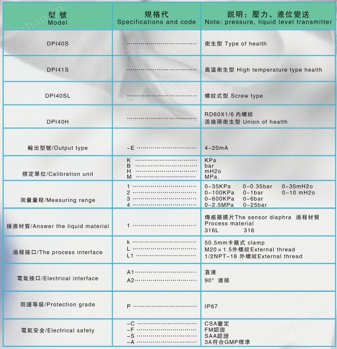 百事得(ETbaissde)DPI系列衛生型壓力、液位變送器在設計過程中全面考慮在清潔用于CIP/SIP(原位清潔和原位滅菌)的設備時,表面結構設計采用平面隔膜密封,確保過程連接中無死區,在整體設備清潔和滅菌時能輕松方便的完成對測量儀表的清潔,平面隔膜密封設計根據EHEDG規范第8號文件“衛生型設備設計準則”中一類衛生標準的要求,測量端無死區,表面光潔度Ra<0.8um才能滿足清潔過程的要求。 百事得(ETbaissde)DPI系列衛生型隔膜密封壓力、液位變送器在結構設計過程中首先考慮過程連接的隔膜密封系統,特別適合用于衛生型應用中的壓力、液位測量。DPI40型無菌卡盤式隔膜密封通過EHEDG(歐洲衛生工程與設計組織)的測試,非常適合衛生型應用。 無菌卡箍式隔膜密封的安裝和拆卸操作都非常簡單,通過特殊的焊接套管可以實現與容器和管路的沖洗密封,可以為用戶提供易于清潔的壓力測量點,適合CIP(原位清潔)和SIP(原位滅菌)應用,高溫型可到150℃不需要散熱裝置。