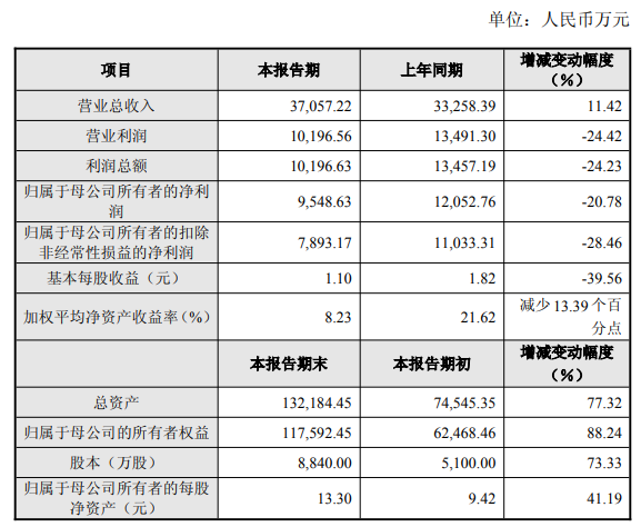 5、報告期末公司歸屬于母公司所有者的每股凈資產(chǎn)為13.30元,較期初增加41.19%,主要系公司上市發(fā)行新股和凈利潤留存所致。