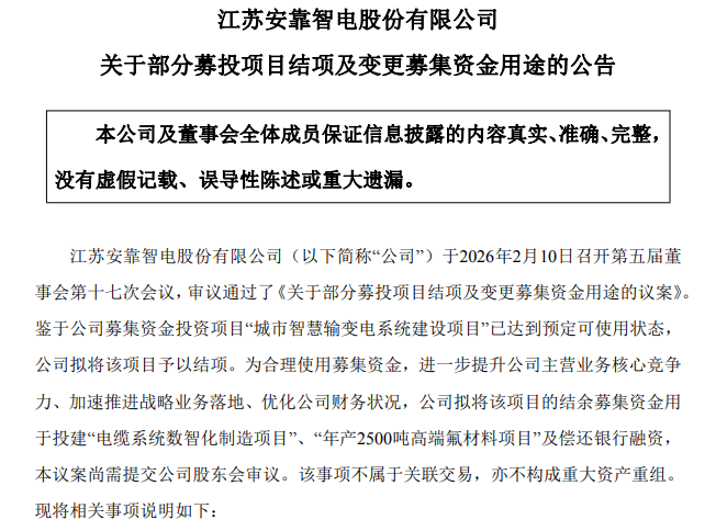 儀表網 企業動態】近日,安靠智電(300617)公告,公司于2026年2月10日召開第五屆董事會第十七次會議,審議通過了《關于部分募投項目結項及變更募集資金用途的議案》。鑒于公司募集資金投資項目“城市智慧輸變電系統建設項目”已達到預定可使用狀態,公司擬將該項目予以結項。為合理使用募集資金,進一步提升公司主營業務核心競爭力、加速推進戰略業務落地、優化公司財務狀況,公司擬將該項目的結余募集資金用于投建“電纜系統數智化制造項目”、“年產2500噸高端氟材料項目”及償還銀行融資,本議案尚需提交公司股東會審議。該事項不屬于關聯交易,亦不構成重大資產重組。