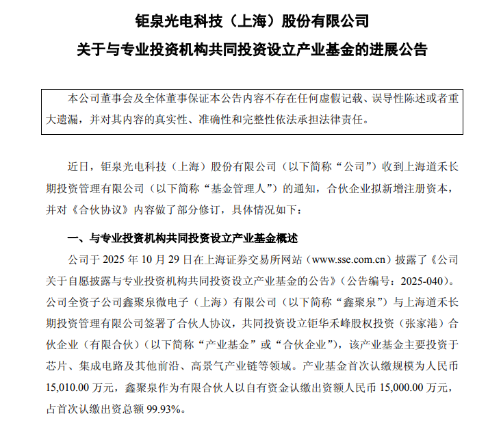 鉅華禾峰產業基金自2025年10月落地以來,始終聚焦芯片、集成電路及前沿高景氣產業鏈領域,是鉅泉科技打通產業鏈投資、強化產業協同的核心平臺。資料顯示,基金初始認繳規模15010萬元,鑫聚泉作為主要出資方,占首次認繳總額99.93%;2025年12月,華福成長首次認繳1億元,推動基金規模擴容至2.5億元,完成首輪布局。