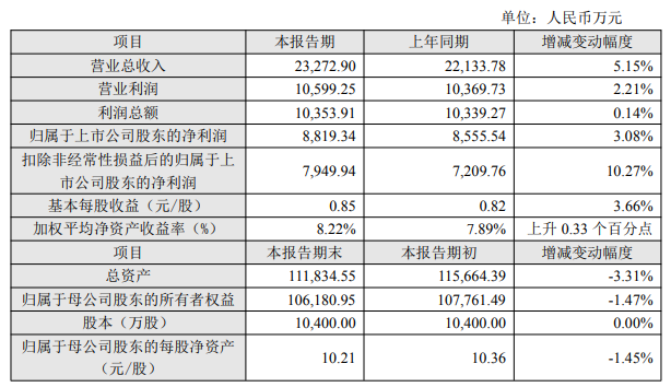 報告期內,公司實現營業總收入23,272.90萬元,較2024年度同期增長5.15%;實現營業利潤10,599.25萬元,較2024年度同期增長2.21%;實現利潤總額10,353.91萬元,較2024年度同期增長0.14%;實現歸屬于上市公司股東的凈利潤8,819.34萬元,較2024年度同期增長3.08%;實現扣除非經常性損益后的歸屬于上市公司股東的凈利潤7,949.94萬元,較2024年度同期增長10.27%。