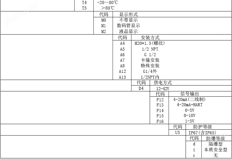 | 精 度 | 0.1%F·S 0.25% F·S 0.5% F·S | | 測量范圍 | -95KPa~60MPa間任選 | | 測量介質 | 液體、氣體、蒸汽 | | 存貯溫度 | -40~125℃ | | 電源電壓 | 12~24V DC | | 使用溫度 | -10~80℃ | | 防腐材料 | 316L不銹鋼 | | 溫度影響 | <0.02%/℃ | | 負載電阻 | ≤750Ω | | 過載能力 | 量程的1~2倍 | | 機械保護 | IP65 | | 濕 度 | ≤95%RH | | 輸 出 | 二線制 4~20mA DC | | 關聯設備 | EXZ231B型安全柵 | | 重 量 | <1Kg | | 零點溫度系數 | 小于0.02%/℃ | | 滿程溫度系數 | 小于0.02%/℃ | | 電源電壓 | 24V DC | | 防爆等級 | iaⅡCT5 | |