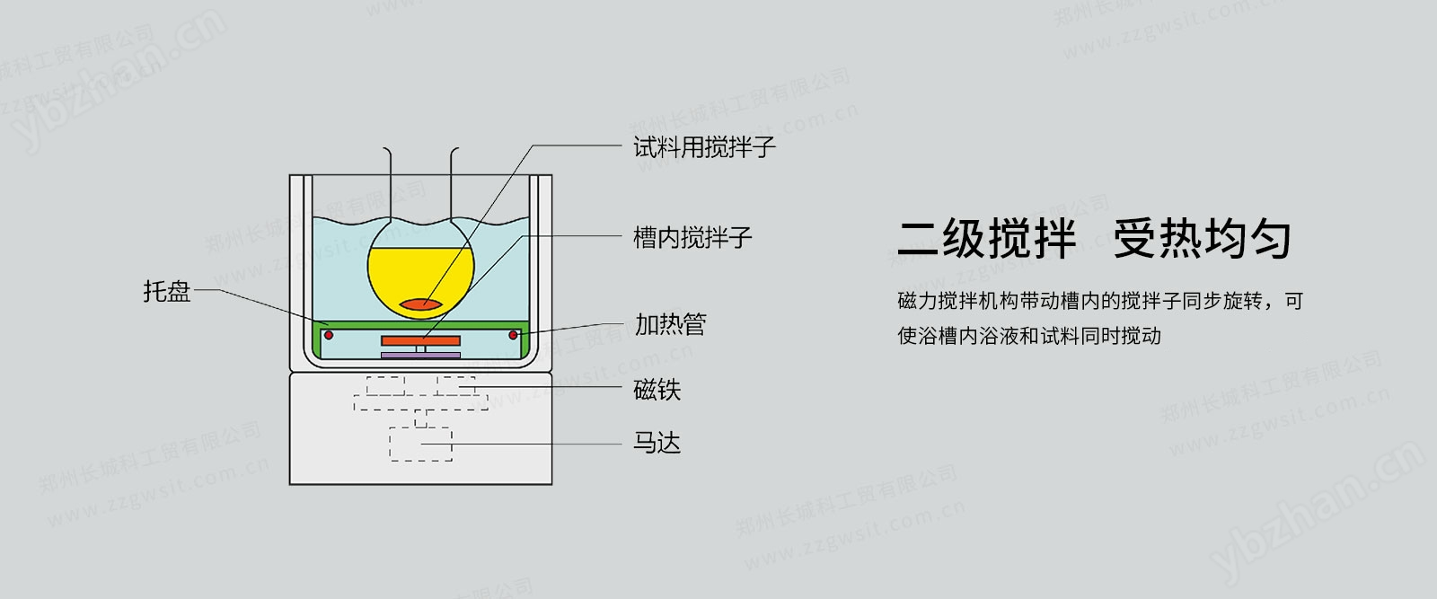 ●磁力攪拌機構(gòu)帶動槽內(nèi)的攪拌裝置同步旋轉(zhuǎn),攪動浴液,使浴液受熱均勻;